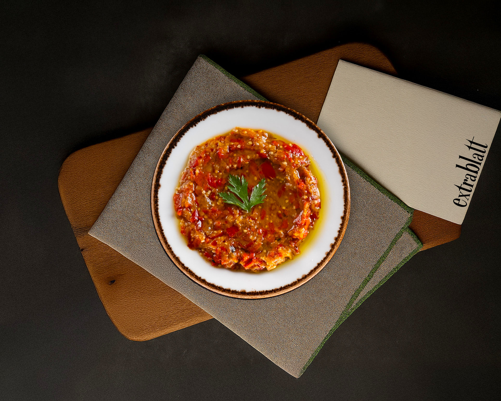 Közlenmiş patlıcan, közlenmiş kırmızı kapya biber, zeytinyağı ile hazırlanır.