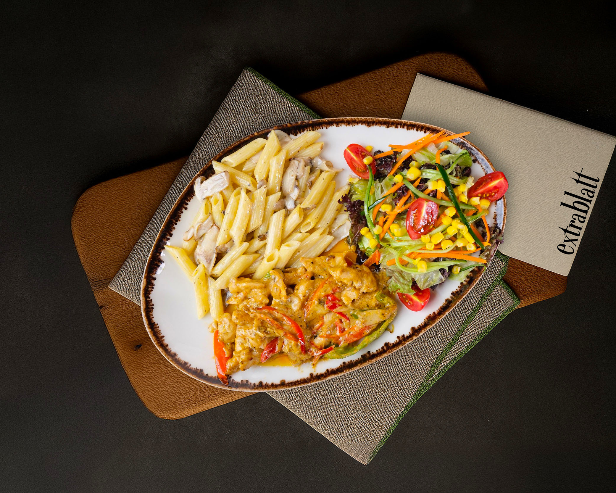 Izgara tavuk göğsü, özel Cafede Paris sosu, krema, tereyağı, hardal, baharat karışımı ve garnitür sebzeler ile hazırlanır.
