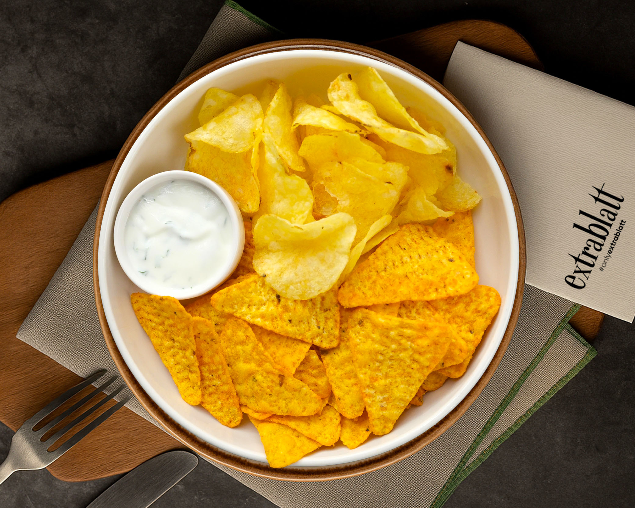 Baharatlı cips , patates cipsi ; ranch sos ve romesco sos eşliğinde sunulur .