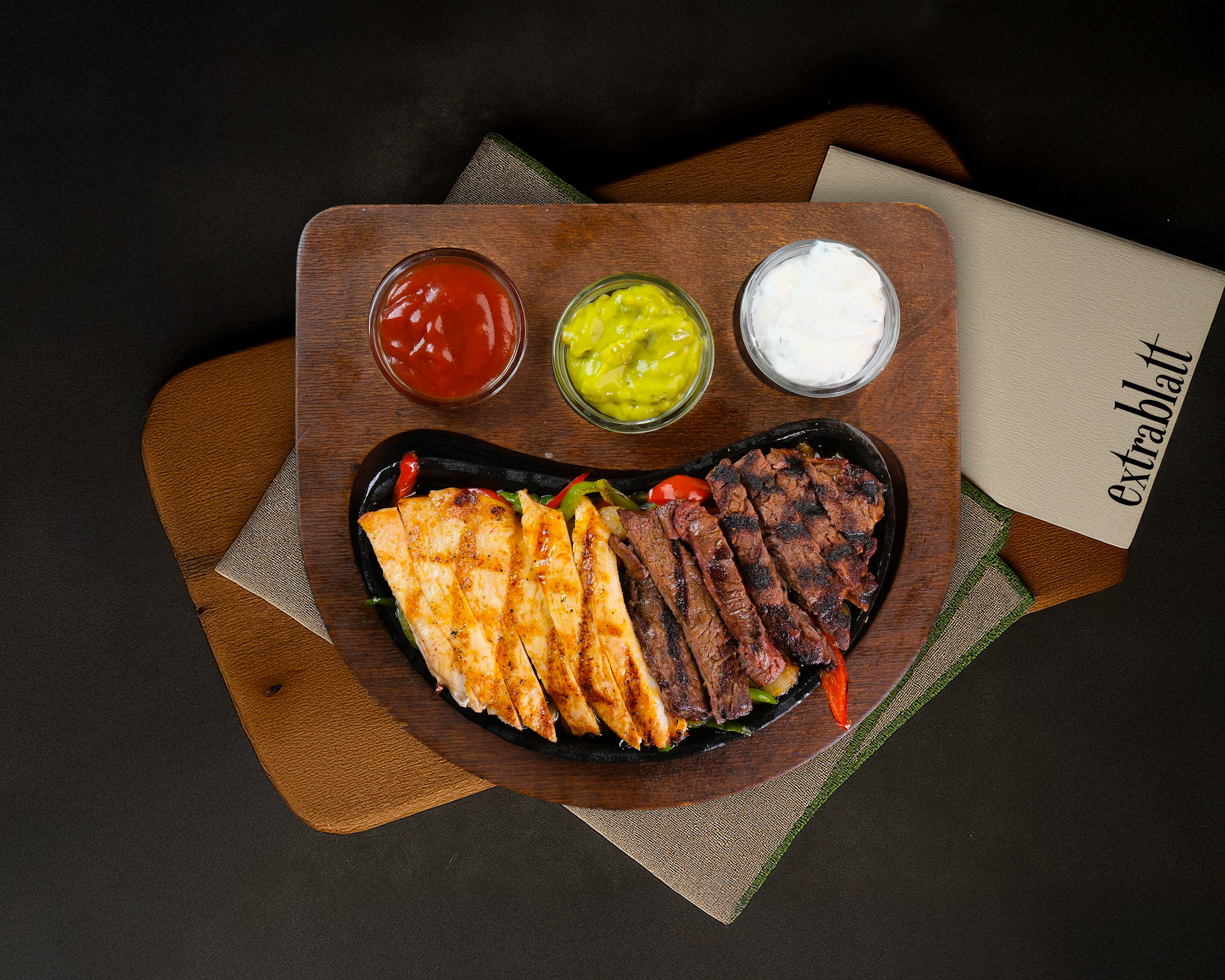 Dana bonfile , tavuk göğüsü parçaları , renkli biber , arpacık soğan , fajita baharatı ; tortilla ekmeği , avokado sos , ranch sos , salsa sos ile servis edilir.