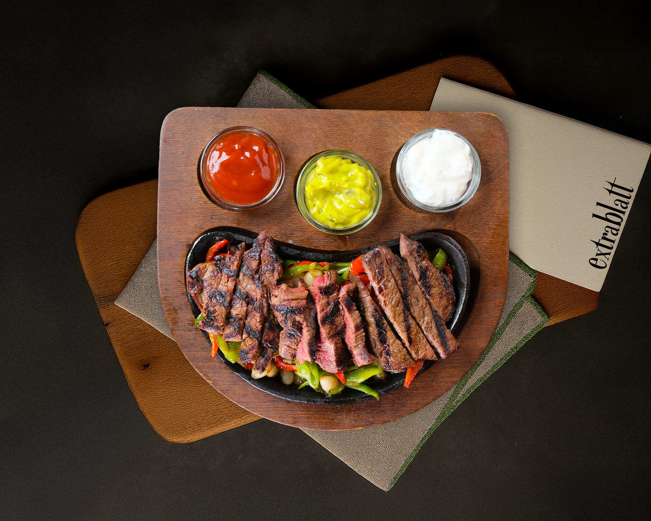 Dana bonfile , renkli biber , arpacık soğan , fajita baharatı ; tortilla ekmeği , avokado sos , ranch sos , salsa sos ile servis edilir.