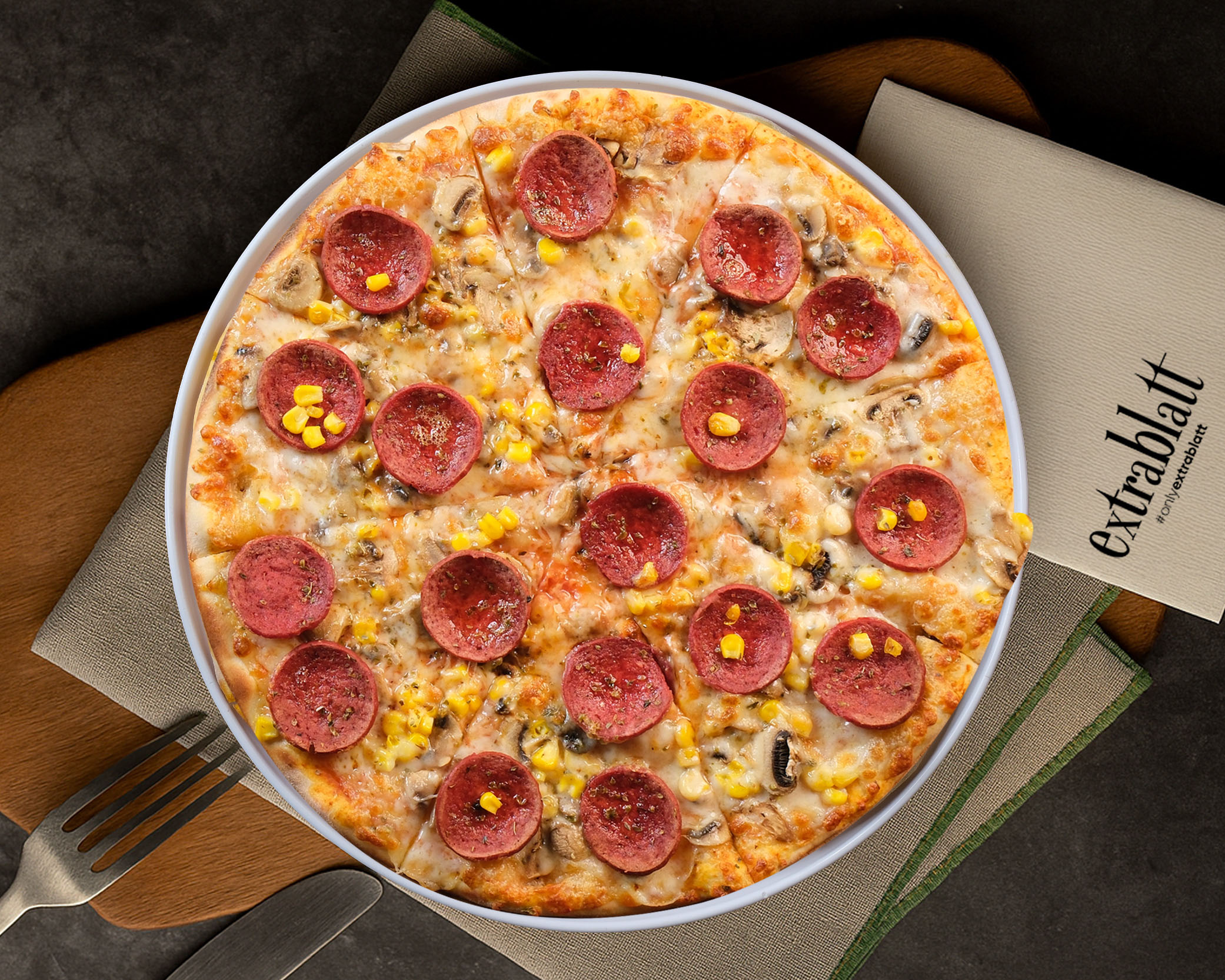 Piza sosu, mozerella peyniri, sucuk, mantar, tane mısır, kekik ile hazırlanır.