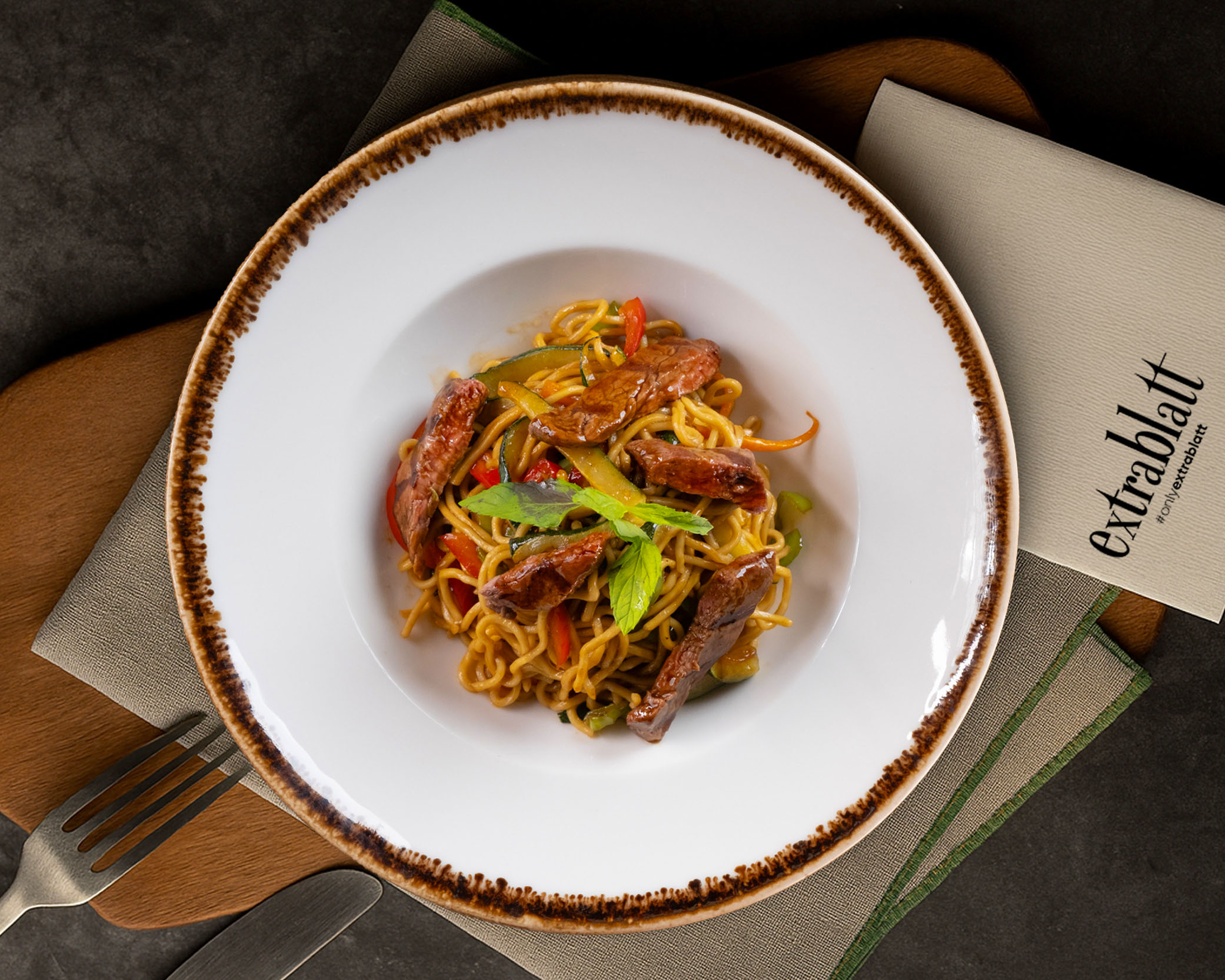 Noodle makarna, dana bonfile parçaları, havuç, kabak, kırmızı kapya biber, yeşil kapya biber, mantar, susam yağı, soya sos, oyster sos ile hazırlanır.