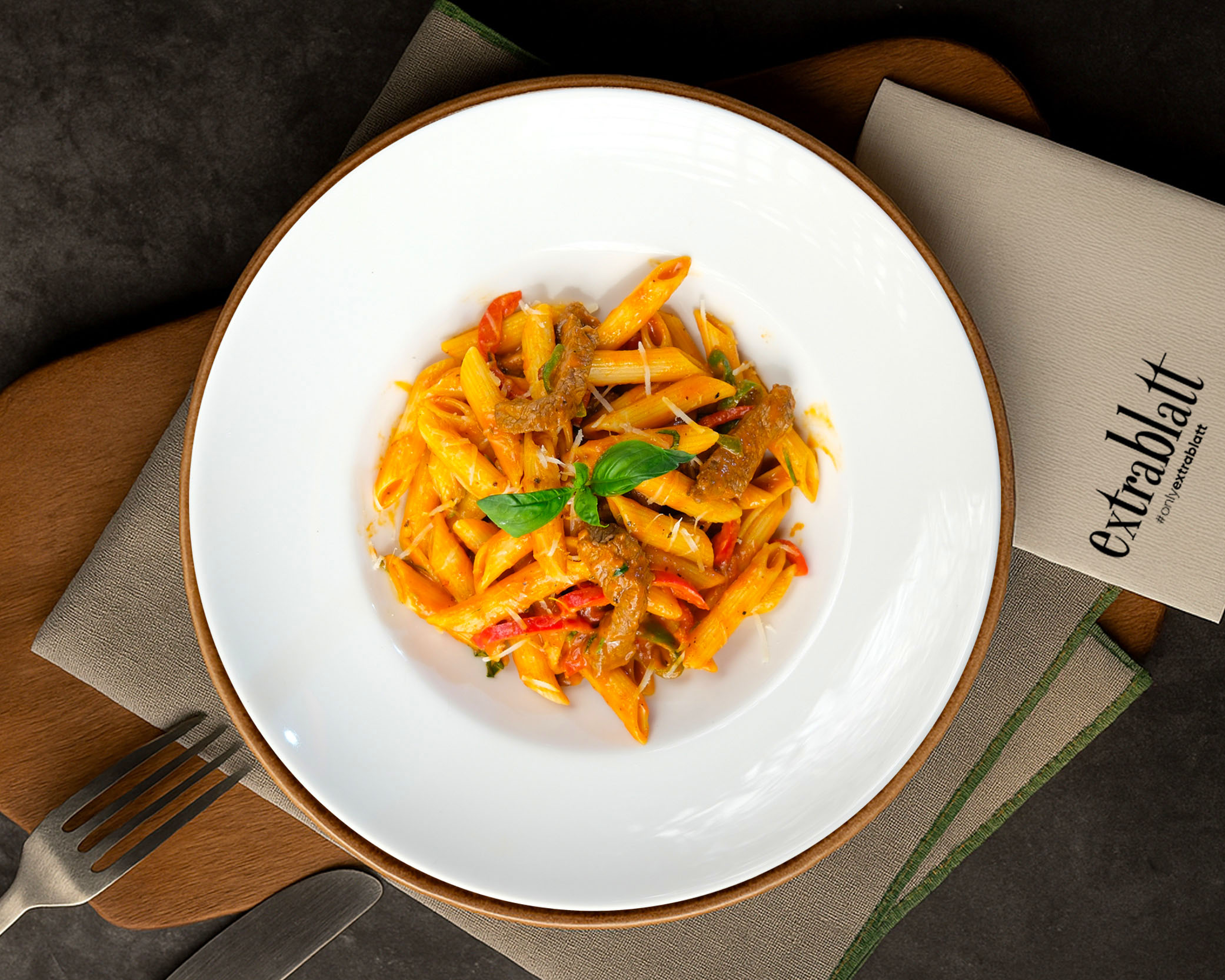 Penne makarna, domates sos, dana bonfile, renkli biberler, zeytinyağı ile hazırlanır.