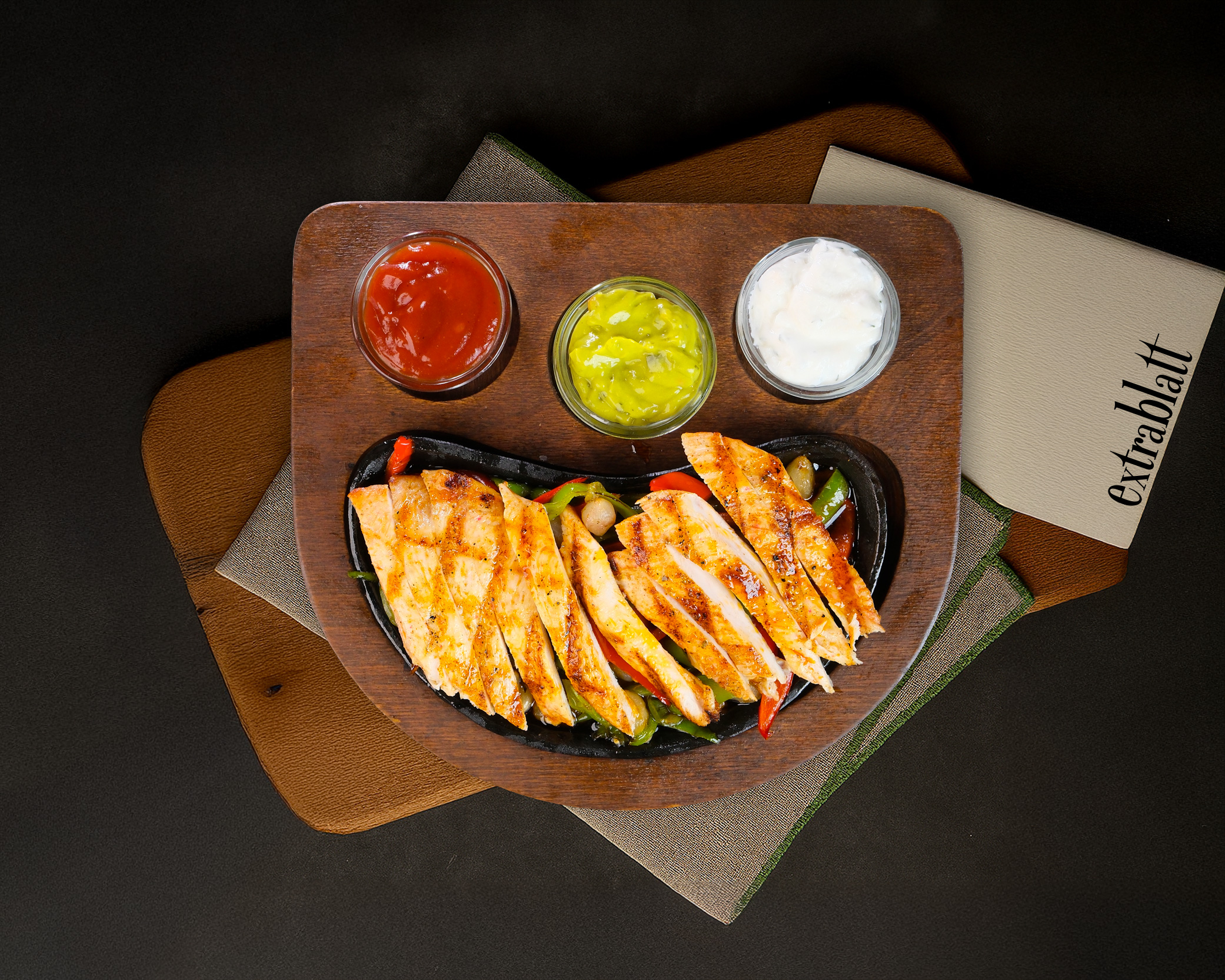 Tavuk göğüsü parçaları , renkli biber , arpacık soğan , fajita baharatı ; tortilla ekmeği , avokado sosu ranch sos ile servis edilir.